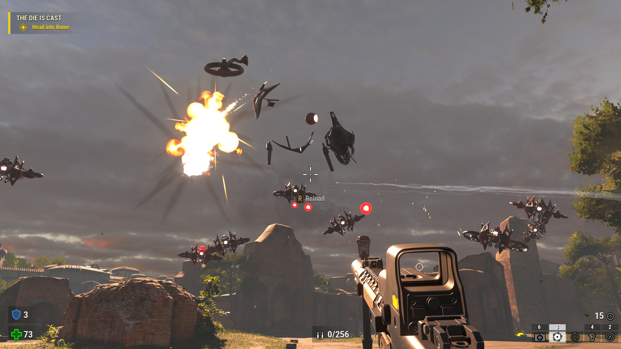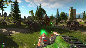 There’s been a few changes to the combat to add oddly missing features in norm among other FPS games, all very welcome. You can now do bonus damage on enemies with head shots, and many classic weapons now have attachments you can get during the campaign. The shotgun becomes useful the whole game with the new grenade launcher attachment that lobs one out in an easy to read arc, the rocket launcher can lock-on to an enemy and shoot up to five rockets, the electric/laser gun can fire a Quake thunderbolt style death beam, and the grenade launcher can remote detonate fired grenades into smaller explosives that go off instantly. The rocket launcher’s new feature instantly turn it from one of the lesser launchers in FPS history into a major problem solver, a real standout among these attachments.