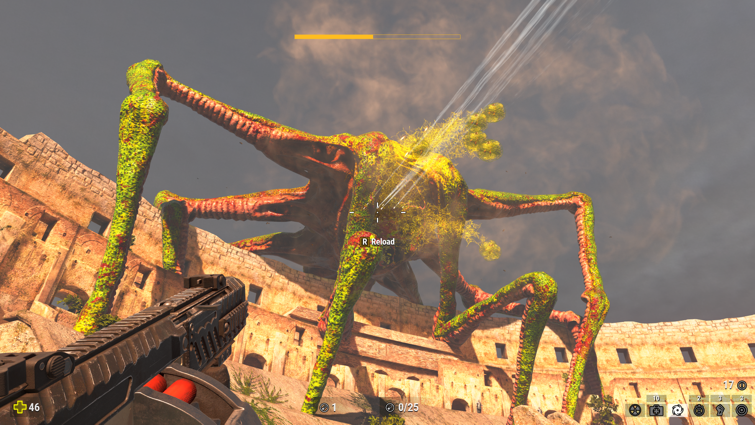 You’ll also noticed that Serious Sam 4 runs very weird compared to its contemporaries. Textures have a habit of popping in a lot more then usual for these sorts of games, and animations range from polished to barely existent. This seems to be a mixture of maximizing the engine for allowing as many models as possible on screen and helping the player read mobs better. The former can be seen in just how ridiculously big the mobs can get (even for this series), while the later becomes more obvious in play. Croteam has embraced their B-game status fully, despite flexing that they can do a more polished, traditional release, giving the game a personality that fits it well. Female gnaars are ape-like monsters with fluid, complicated running cycles, while the male counterparts move like their mannequin like forefathers from TFE. All the monsters get this sort of treatment, half moving fluidly, the other half stiffly, but that makes them more distinct in play, easier to pick out on the environments and among other enemies.