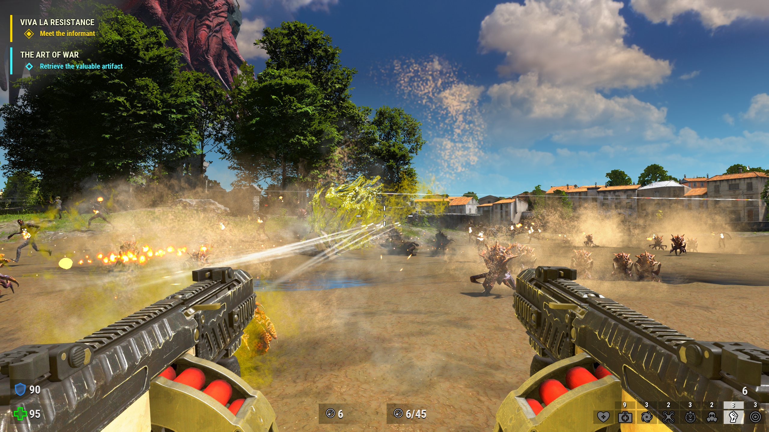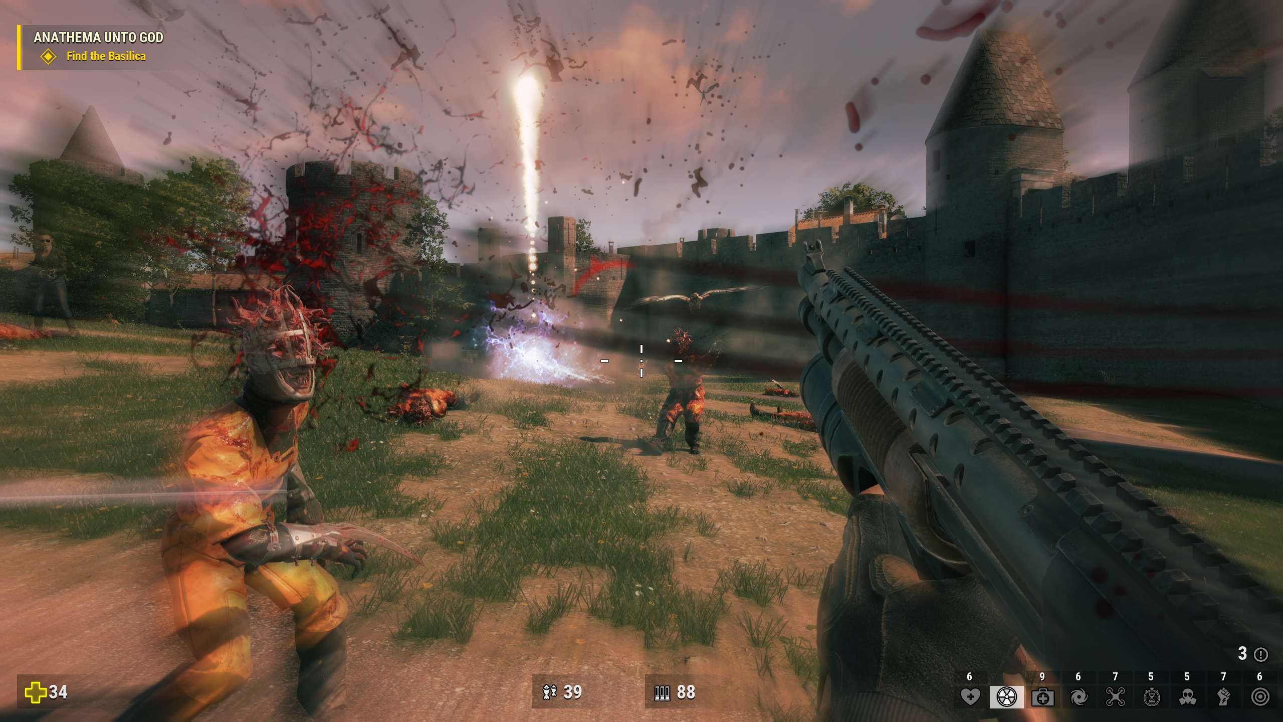 The game is another prequel…maybe? Serious Sam 4 is purposefully playful with its continuity, with nods to the time travel concept possibly affecting the current story, and it ends on a note that could go in all sorts of wild directions. The set-up is that we’re in the middle of Mental’s invasion, as Sam (now confirmed as a former space captain) and his crew travel the world in a play to find the holy grail and get a new weapon against the hordes. However, they have to deal with the general in charge of Mental’s European front, Lord Achriman, to get there. The team is tested in turbulent trials of combat, unexpected allies are found, and all set against the scenic backdrop of lived in European countryside and towns.