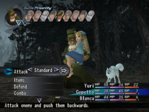 By the by, four party members can brawl at a time, up from the first game’s max of three, and two or more of these can pool their efforts via the newly-minted “Combo” tactic. When someone’s turn comes up, you can opt to delay their action and instead have them run over and link up with someone else farther down the line; once the latter takes his/her turn the waiting member(s), following a quick button prompt, can then immediately follow up, and the more consecutive hits are landed the greater the damage bonus you get. To maximize effectiveness, everyone’s standard physical attacks can be directed to knock enemies into or out of the air, or farther away, to set them up for the next step of the beating; if you can successfully orchestrate a full-party Combo you have the option of finishing it off with a super-powerful special spell. Lastly, as you use certain party members more often their “Affinity” for each other will gradually increase, leading to more effective Combos.