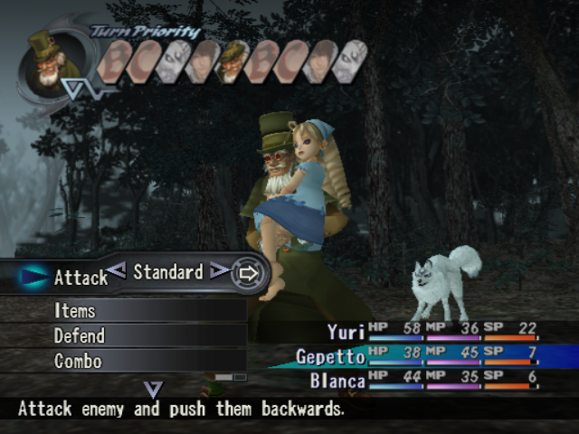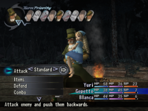 Alice’s elderly uncle and a famous puppeteer who, after the sudden death of his only daughter, retired to Domremy and met a sullen Yuri there. The latter, as it turned out, had just arrived from Zurich, where he had laid Alice to rest with his own hands; Gepetto decides to stick by the young man until fate takes him elsewhere. Like Zhuzhen before him Gepetto is chock full of helpful information and experience, though at times his better judgment is overtaken by a weakness for liquor and/or lechery. He fights indirectly, via a favorite marionette named Cornelia: buying and equipping different costumes for her both changes his elemental affinity and unlocks new special spells for his use.