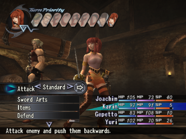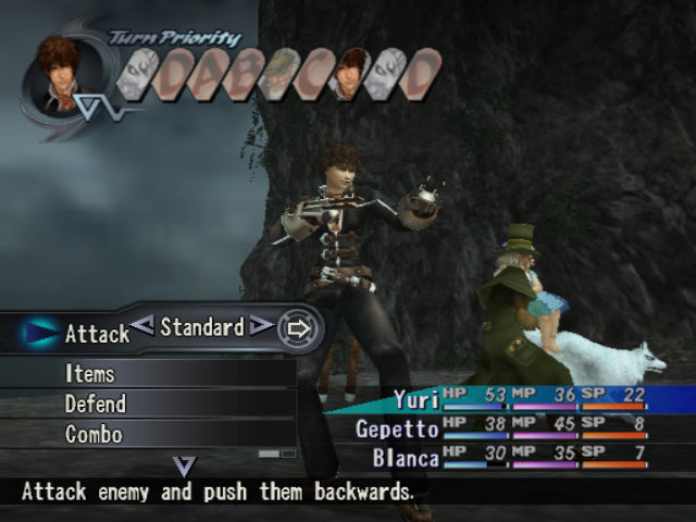Battle, of course, is where most of this stuff comes into play: in addition to the aforementioned customization options a bevy of new combat features are on tap to keep things interesting. First and foremost, combat now occurs in “actual space” – participants on both sides will constantly break formation to deal physical strikes, or cast spells to slam enemies away and even into walls. Unlike Lunar or Grandia there’s no “move” stat to consider, and thus no real need to ever worry about being “out of range”, but positioning must still be taken into account since most special attacks and magic have a limited area of effect. To help keep track of this more involved brand of combat the overall turn order is now displayed onscreen, as is an HP meter for enemies, which makes formulating and adjusting strategies mid-fight much easier.