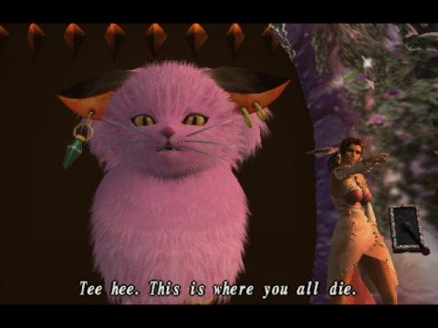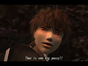 If there’s a potential downside to the presentation, however, there is some truth to the notion that it’s not quite as distinctive as it might be – though there are certainly some revolting creatures slithering around, the first game’s marquee horror flavoring has been inarguably pared back, as reflected in a less-restrictive “Teen” ESRB rating. On the flipside of the coin, the humor quotient has been well and truly let off the leash: a parade of bizarre personalities and situations is on hand for players to gawk at in disbelief, from an out-of-nowhere Metal Gear Solid spoof sequence (proof positive that yes, it is possible to make Metal Gear Solid even sillier than it already is) to a giant, fluffy pink kitty-cat boss (prompting the inevitable “That is one giant pussy” outburst from Yuri). To be sure, straight-up comedy isn’t a whole lot more common than horror when it comes to JRPGs, so the overall mood does still stand out from most of the competition. One long-running side mission in particular, involving hunting down “stud” cards was…interesting enough by itself to inspire a Penny Arcade comic strip.