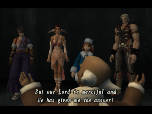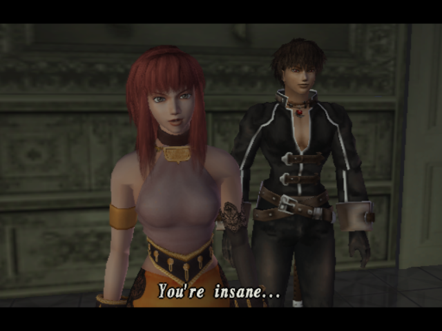 To some extent, the same principle applies to the game’s aural elements. Hirota and Mitsuda are back on the job, with newfound assistance courtesy of Kenji Ito (the “SaGa” series and others) and Tomoko Imoto (nee Kobayashi). Covenant‘s music takes things in a bit more of an orchestral direction, and thus remains just as fitting to the occasion, though this in turn means that some of the most unique, eerie interludes aren’t as prevalent; there are still sections that can make your hair stand on end, especially as you get farther in and encounter some of the ickier baddies, but generally speaking, while the music makes for a great listen, it’s also a touch more predictable in nature than its predecessor’s was. Character voices, for their part, are much more prevalent both in and out of battle, and hey, Midway (employing none other than Konami veteran Jeremy Blaustein) actually bothered to translate the whole thing this time – a majority of the English VAs do a good job, though it wouldn’t be a localized JRPG without some mismatched text and cringe-worthy lines sprinkled in.