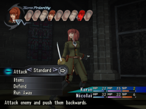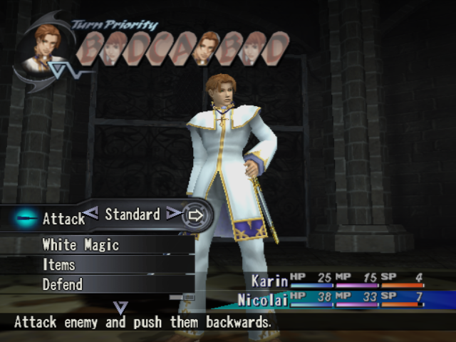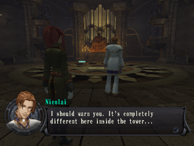 More depressing for Westerners, though, is the fact that they missed out on the “Director’s Cut” re-release that Japan got about a year after the original printing: similar to the “FES” edition that Persona 3 would receive in 2007, it not only retailed for a “Best” label’s discount price but included some supplemental content. Most of it is pretty standard “omake” fare, like new items, music, and plot scenes, plus HDD support and a few other tweaks; the main attractions here are a pair of additional dungeons. One is an optional end-game side trip with an über-boss at the end, but the other is a sudden cut-away in the middle of the story, during which you get to temporarily play as Nicolai and two other central villains. The extras on offer aren’t exactly indispensable, but they are nice bonuses for anyone with access to them; as it happens, owners of the later-released PAL version with enough technical know-how can actually dig up some of the hidden stuff nestled away in the coding.