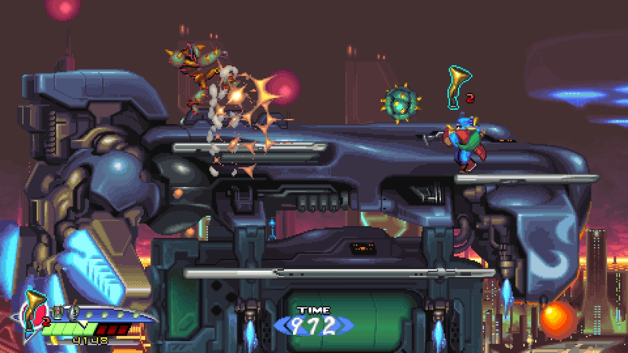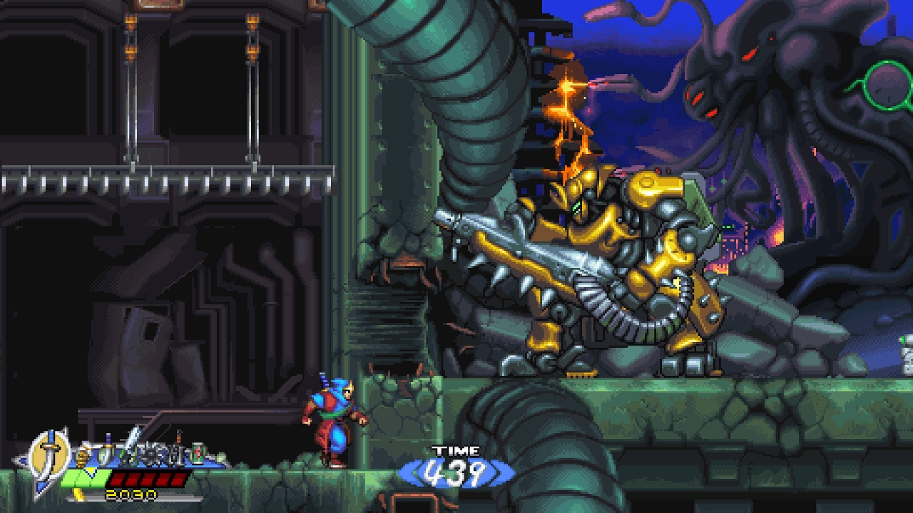 The level designs have been expanded, using the NES levels as a baseline so they’re still recognizable but remodeling them to make them feel a little more expansive. The original game only had five levels, while this remake adds a new one, which takes place in a blast furnace and an enormous freezer. The bosses see the most impressive upgrades – take, for example, the second level boss, which was originally an enormous vehicle. Rather than just focusing on a single weak point, you have to take out a few extra sections, hopping on top of it while avoiding lasers to strike the final blows. The third level boss in the original game was some kind of samurai ghost that fell to pieces when getting hit but reassembled itself to continue attacking. In this remake, every few times you knock it down, it comes back larger, until eventually it’s an enormous monster consisting almost entirely of scrap metal and other junk. One late boss originally had you fight a falconer and his bird; here, once they’ve taken enough damage, they fuse together so the human grows a pair of robotic wings.