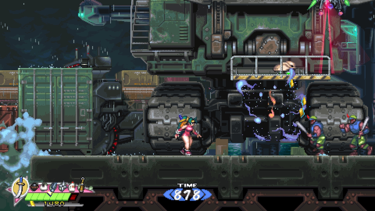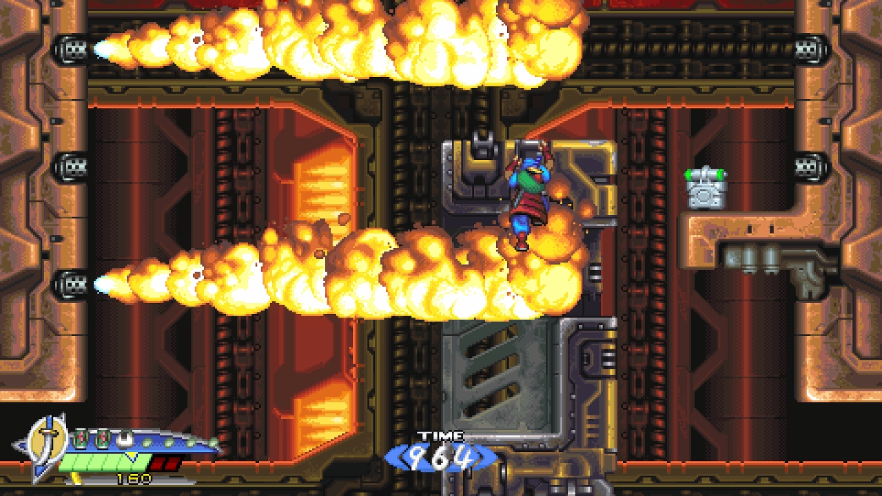 For the most part, it’s tough but fair. Some of the frustration comes with the territory. There’s plenty of spots where you can be knocked into pits by enemies, but at least you respawn nearby with only a small bit of damage. When dealing with subweapons and other items, you can only quickly switch between your sword and the most recently obtained item. If you need to dig further into your inventory, you need to hold down the equipment button and cycle through them. The game doesn’t pause when you’re doing this, so you need to play ahead, since you can’t really stop to rifle through your pockets when you’re being assaulted by robots.