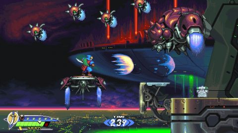 The level designs have been expanded, using the NES levels as a baseline so they’re still recognizable but remodeling them to make them feel a little more expansive. The original game only had five levels, while this remake adds a new one, which takes place in a blast furnace and an enormous freezer. The bosses see the most impressive upgrades – take, for example, the second level boss, which was originally an enormous vehicle. Rather than just focusing on a single weak point, you have to take out a few extra sections, hopping on top of it while avoiding lasers to strike the final blows. The third level boss in the original game was some kind of samurai ghost that fell to pieces when getting hit but reassembled itself to continue attacking. In this remake, every few times you knock it down, it comes back larger, until eventually it’s an enormous monster consisting almost entirely of scrap metal and other junk. One late boss originally had you fight a falconer and his bird; here, once they’ve taken enough damage, they fuse together so the human grows a pair of robotic wings.