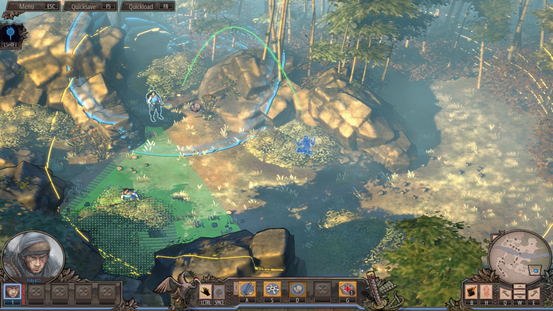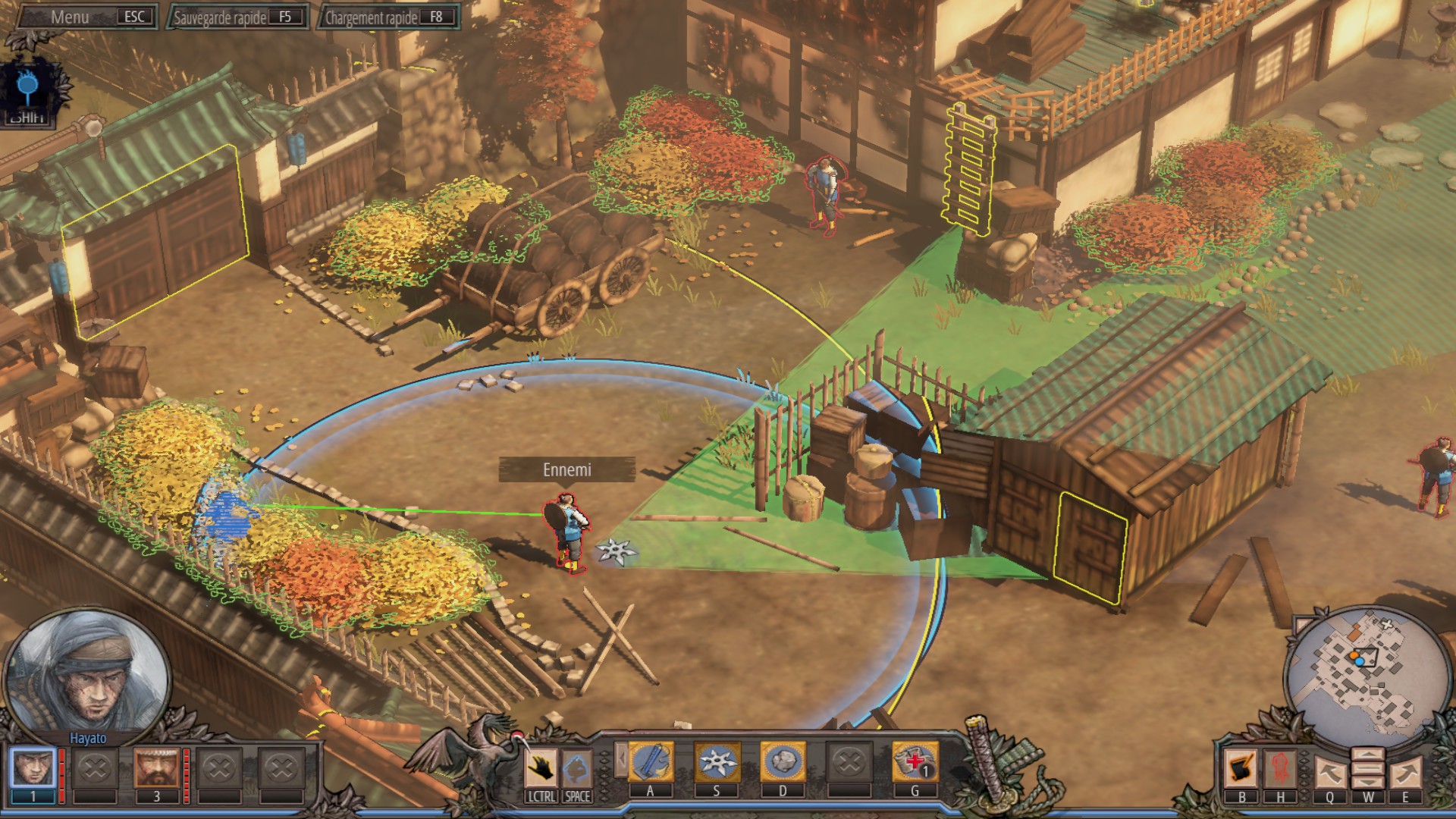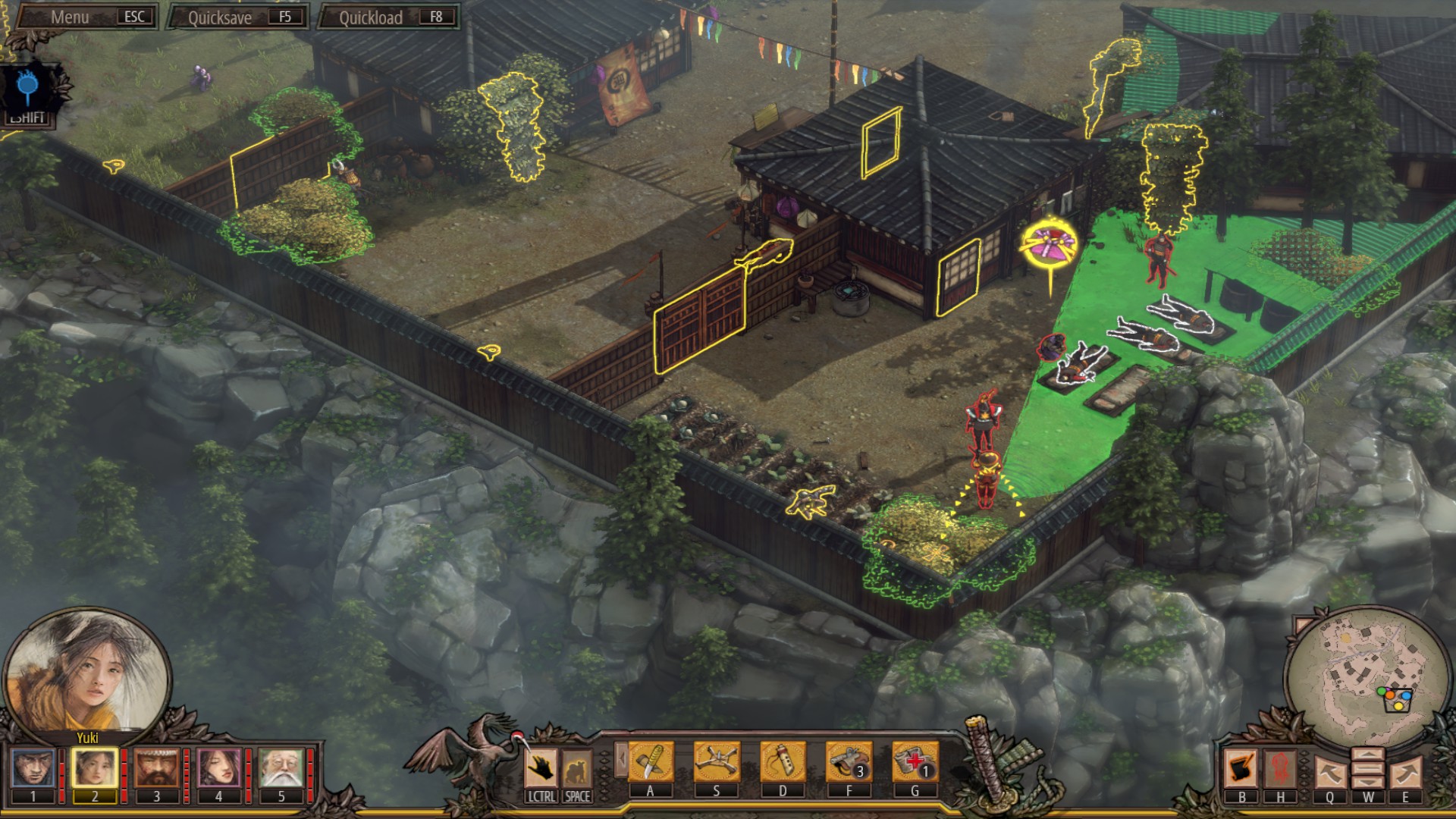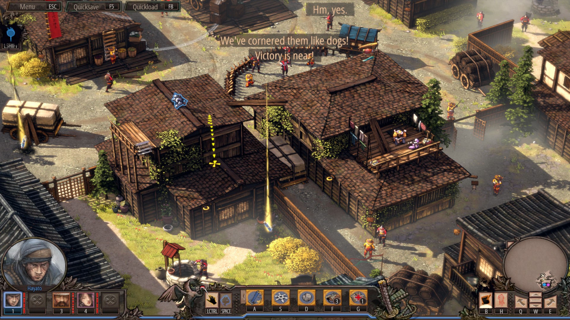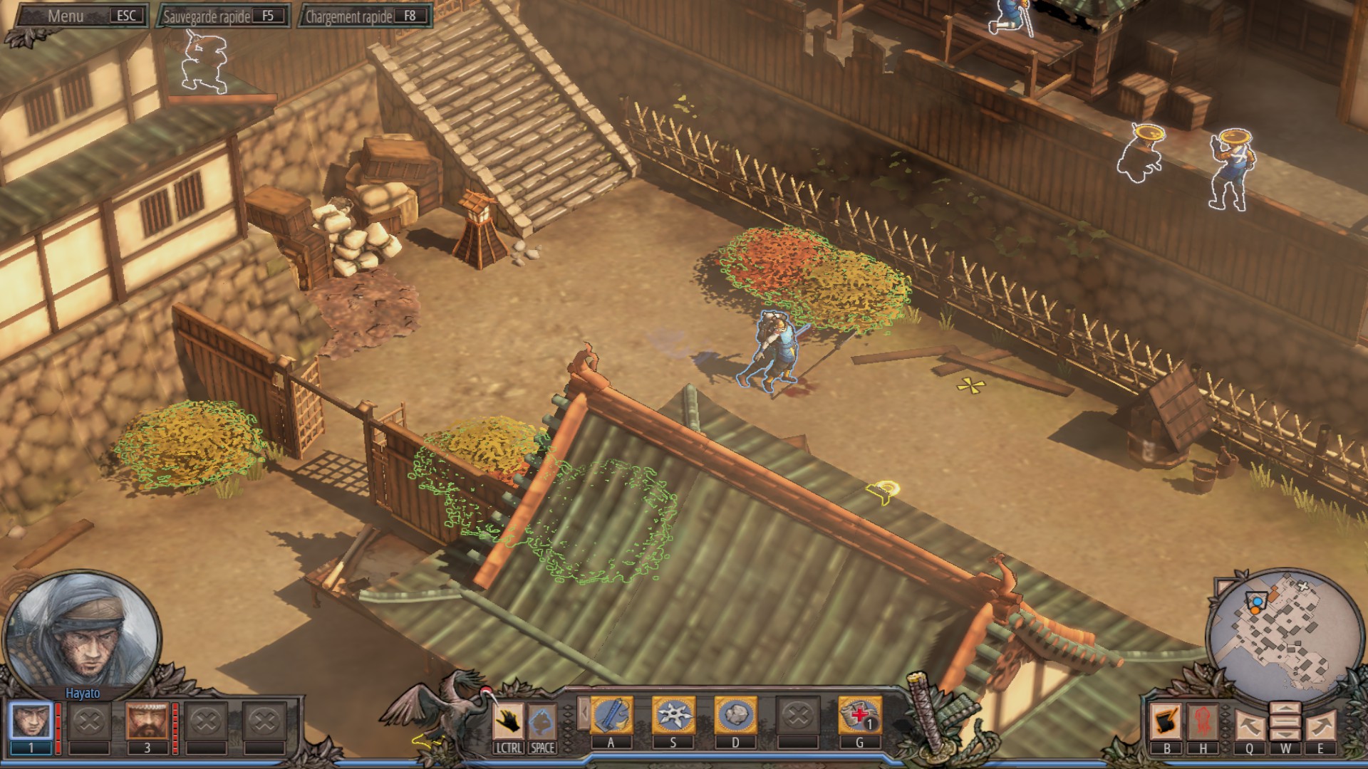 Shadow Tactics follows this basic recipe but with great flair with respect to specific gameplay choices and variations there exists within the genre. The character’s personalities feel familiar, but their specific abilities have been balanced very well – hence, more than previous games, you will need to leverage the whole squad and combine their skills at various points. A lot of the abilities and gameplay choices are borrowed from the Commandos and Desperados series, but skillfully adapted to match the context of feudal Japan: the harpoon from Commandos: Behind Enemy lines is a shuriken; the cigarette pack from Commandos: Beyond The Call of Duty is a bottle of sake; the quick action “let’s sync our clocks” mechanism from Desperados is now a Shadow Mode; the dog in Commandos 2 is now a tanuki. But Shadow Tactics‘ borrowing is very thoughtful and carefully considered; for instance, firearms are all heavily bullet-constrained, disabling the strategy of “shooting in the air and seeing who comes” from all the other games; and a number of innovations from Commandos 2 and later (exploring buildings, inventory management, searching bodies, etc.) are out of scope, which is smart as it helps avoid overwhelming the players with features. It plays like classic Commandos/Desperados, but with the best skills/abilities taken across the genre.