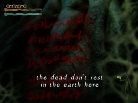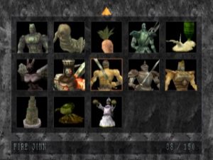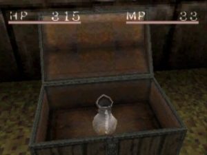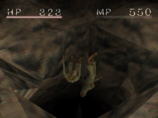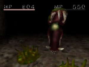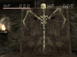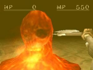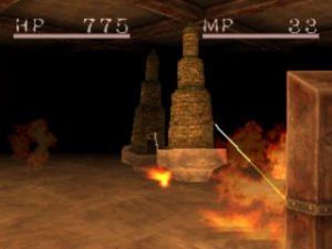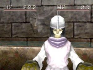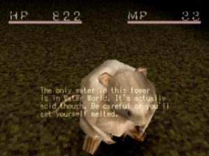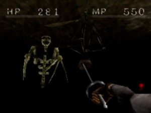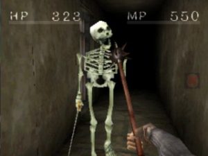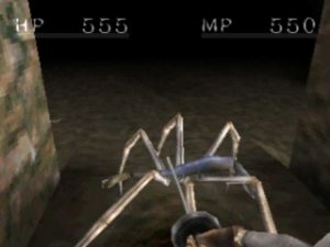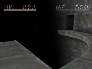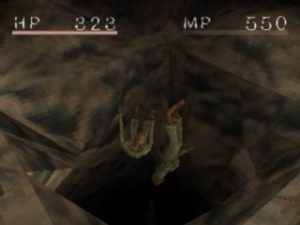 … when you’re not fending off projectiles from the direction of “pitch darkness.” The draw distance is woeful. It is even shorter than the first King’s Field and, while it does also prove effective in imparting severe claustrophobia in the player, it’s frankly bloody annoying in 2011 playing a first person game where you can just about see two meters in front of you but no further! One begins to appreciate the open spaces of the second and third King’s Field game at this point, though here there are somewhat more detailed textures and – shock, horror – shaped walls! Well, occasionally. The usual straight, boxy walls in most places, but you’ll also progress through rather low-poly caves every so often. Oh, and for a 1999 PlayStation game, the amount of edge holes is pitiful. They are persistant and copious. I’m aware that some of this is down to the PSX itself, but there is rarely a moment where you can’t see them. I’m no visual fanatic, but it’s somewhat disappointing.