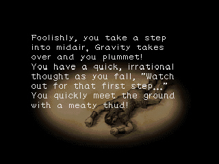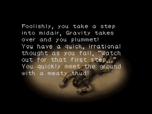 Indeed, the years have not been kind to Castle Shadowgate. Where it used to hold a mysterious labyrinth filled with monsters and traps and all manner of bizarre happenings, its new incarnation is distressingly dull. Its rooms and corridors have devolved into a generic medieval castle, filled with caves, dungeons, libraries, and dozens of dreary, empty rooms. The color palette is almost remarkably drab, and it’s hard to even look at the game without getting vaguely depressed. The general mood of the adventure feels almost like a survival horror game like Silent Hill or Fatal Frame, except there’s never anything to actually be scared of. There are no real monsters, and the only real danger comes from falling off cliffs or running into the occasional trap. (Some of the death messages are amusing, channeling the spirit of the original games, but they’re actually quite scarce. They’re also completely devoid of the silliness of Beyond Shadowgate.) The lack of an interface outside of the inventory and map screens does a good job of involving you in the environment, but it doesn’t make up for its general emptiness.