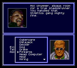 There are some minor problems with Shadowrun. Aside from the dull combat, it’s often a bit aimless, and it’s far too easy to miss small items, halting progress and requiring to scan over every visited scene. The interface could’ve used some work, but it’s about as good as it could be without the use of a mouse. Otherwise, Shadowrun has a fantastic plot, with superb writing – definitely superior to any of the Japanese translated RPGs on the system – and unique gameplay that has cemented its reputation as a cult classic.