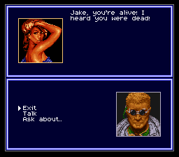 It’s surprising to see such dark subject matter in a SNES game – Shadorun was released in 1993, before Nintendo loosened up its censorship standards, so seeing the protagonist brutally murdered within the first few minutes of the game is bound to have been quite a shock for many players. Yet there are points where Nintendo did some tinkering. Right at the beginning of the game, Jake needs to loosen the lips of an NPC. The only way to do this is by going to the bar, ordering his favorite drink – an “iced tea” – and delivering it to this character, who suddenly becomes a lot more talkative. There’s a beta ROM of Shadowrun floating around, which is slightly less censored than the actual release copy. In the uncensored version, the morgue is referred to as a “chop shop” (keeping in line with the pen-and-paper RPG), and rock musician Kitsune is a bit more flirtatious.