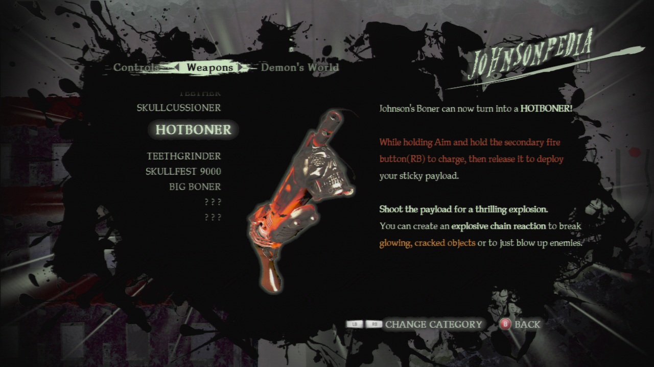 During Garcia and Johnson’s journey, they will occasionally come across higher demons. These demons, handpicked by Flemming, are souls who died in rather spectacular ways. Garcia finds books showcasing their life before Hell before facing off with each of these demons. It’s quite the cast; a man who ate to no fill, dying after eating his harmonica, a young boy attempting to fly, only to fail spectacularly, a masterful opera singer who starved herself, and a beautiful trio of sisters all falling into the same well. These books are read either by Garcia or Johnson, who usually have quips or comments about the events unfolding on the page. The books are noteworthy in that they contain one of the only instances of the word “fap”, internet slang for masturbation, in a video game.