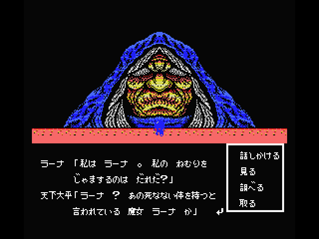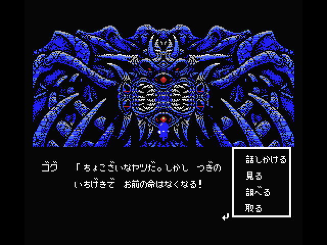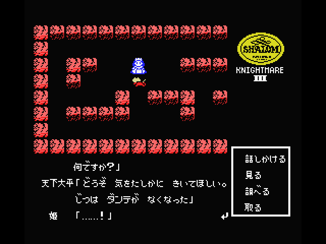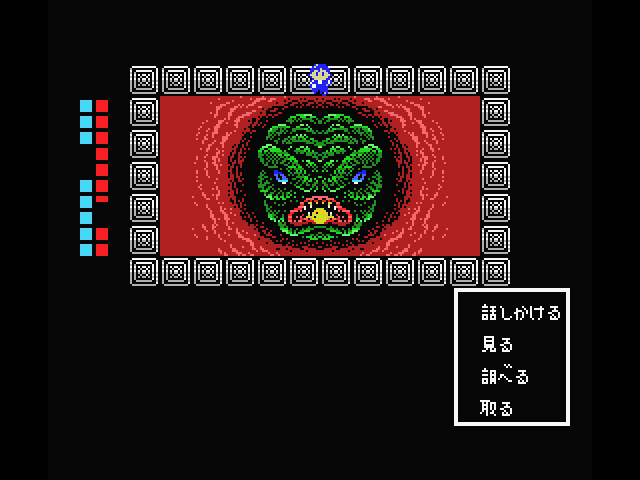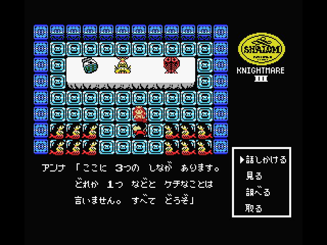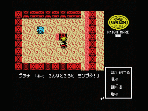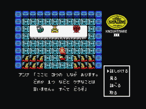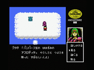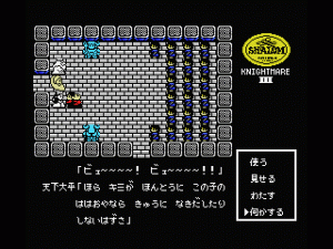 Although Shalom looks a bit like Dragon Quest and other similar games, it’s not actually an RPG because there are technically no battle sequences, at least during most of the game. Instead, it’s more of an adventure game, complete with a command menu, and numerous puzzles to solve in order to proceed. The only time there’s any real conflict is during the boss fights, but almost all of them are different. Some of them are action-based – in the first one, it turns into a side-scroller, as you toss knives at a second, and in the second, you need to catch tumbling boulders and hurl them at the boss’ head. Later ones have much more variety, with one taking on the role of a brick-breaker similar to Arkanoid, and another presenting a box-moving puzzle. Some bosses are destroyed just by conversing with them. There’s a lot of variety and it’s really quite unique.