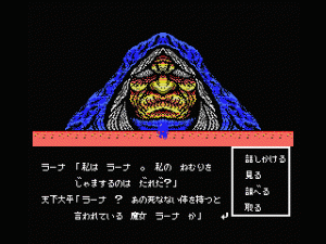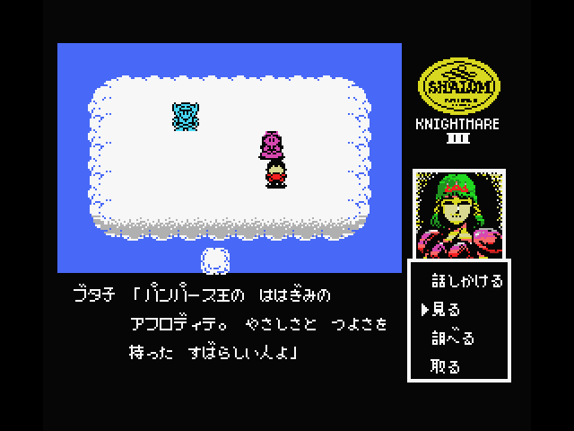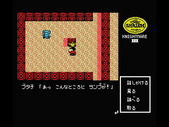 The game actually starts off in the real world, with you, a Japanese high school student, mucking around in computer class. Your female friend comes into the room carrying a new game, Konami’s Shalom for the MSX. (You can name both of them – the boy’s default name translates to “world peace”, while the girl’s translates to “female student”.) You stick the cartridge into your computer and enter your characters’ names, then you’re sucked into the world of the game. (This same trope is later seen in the computer game Companions of Xanth.) When you awaken, you’re greeted by a talking pig, who briefs you on the situation.
