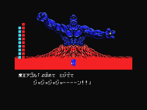 The story takes place in the Grecian Kingdom, 100 years after the end of Maze of Galious. Popolon and Aphrodite have ascended to heaven, and the kingdom is ruled by their child, Pampas. While his rule was peaceful for many decades, despair has overwhelmed the land. Chelsea, daughter of Pampas, has gone missing, which is part of a prophecy that heralds the coming of the Demon King Gog. It’s up to you to take up arms and defeat the eight demon lords, before taking on Gog himself. The pig, named Butako (which means “little pig” – she’s a girl) jumps onto the hero’s shoulders and accompanies him throughout the game.
