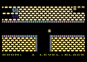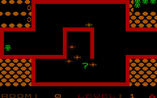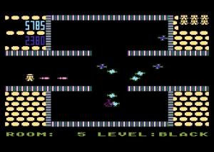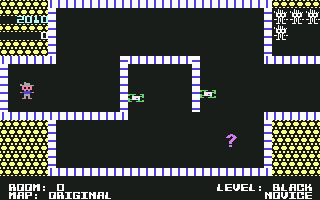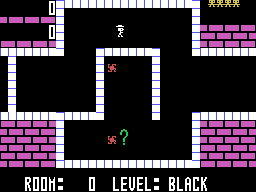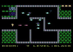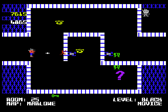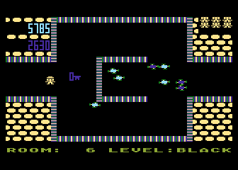 A reasonable number of games from this era were trying to be like popular arcade titles, while Synapse’s best entries took these concepts and expanded on them. In this case, Shamus is basically Stern Electronic’s Berzerk, but with a focus on exploration. In Berzerk, you controlled a little stick figure guy navigating around single screens, shooting hostile robots. When you cleared the area, you’d run to the exit, and then randomly be transported to some other screen, a cycle which continued until you ran out of lives. Shamus keeps the running and gunning aspect, but instead creates a persistent game world with a total of 128 rooms you can explore. There are colored locked doors that block your progress, which are opened up by finding the appropriately colored key. Each of the game’s four main levels are structured like simple mazes, requiring that you either carefully map out everything or memorize their layouts. Though the map design is set, the enemy locations and some items, like extra lives, are randomized when you enter or re-enter screens, while keys are semi-random, sometimes popping up in specific areas or across a predetermined set of rooms.