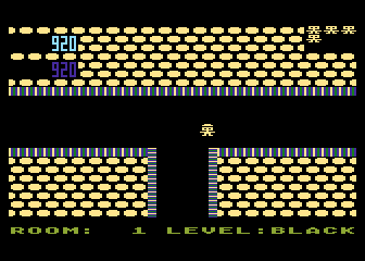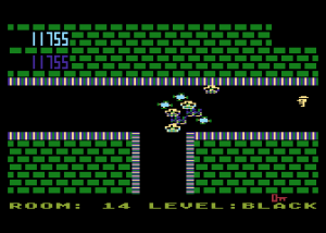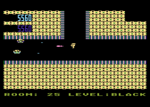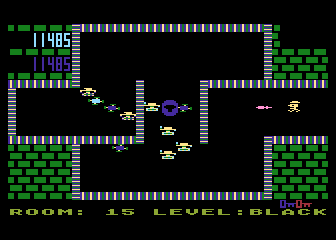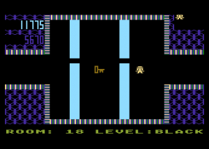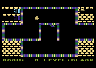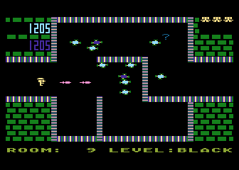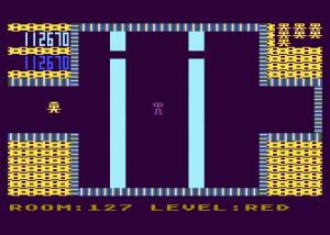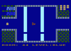 Also like Berzerk, there’s a tiny horizontal line, one pixel in height, between the hero’s head and his hat, at least in the original Atari version. Bullets can pass directly through due to the way the hit detection works, though this is a daring move to try to pull off. Your shivs can cancel out enemy fire too, through due to their small size, it’s hard to make them collide. The walls are electrified with a pulsing glow glow (the effects vary depending on the computer), and touching them will spell instant death. There are different wallpapers in each room, and each area is coded with various background colors, which help prevent the game from getting too visually repetitive. With 128 screens total, it’s a fairly lengthy game, taking about an hour to complete a run if you know what you’re doing. But there’s also no save function nor any continues, so actually reaching the end requires quite a bit of time and skill.
