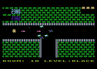 The IBM PC version has the same sprite design as the Atari version, but since it runs in CGA, the color scheme is much uglier, and it’s completely missing the electrified wall effect. The sound effects are also only played on the scratchy PC speaker. For the most part, it plays well, except for one extremely nasty glitch when playing with the keyboard – the movement will sometimes “stick” after taking a shot, causing the hero to move a few steps, potentially right to their death. Playing with a joystick fixes this, thankfully.