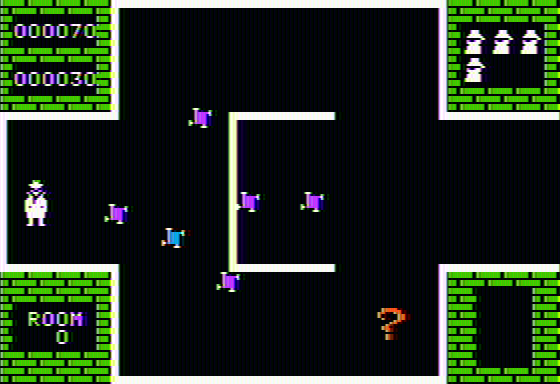 The Apple II version redesigns the hero to look more like a trench coat-wearing detective, with a larger sprite but losing the detail on the face. But the speed is extremely slow, and the entire game pauses every time you hit an enemy to play a sound effect, which makes for wretched pacing. The VIC-20 version is visually the simplest, which removes most of the backgrounds for pure black, and completely changes the look of the walls, so they’re thicker and look more like conveyor belts. Due to the changes to accommodate this, many screens have been redesigned, and most areas are more cramped. It’s also half the size of the Atari version (8k) and has only 32 screens. Amusingly, Shamus yells out “Ouch!” in a little speech balloon when gets fried.