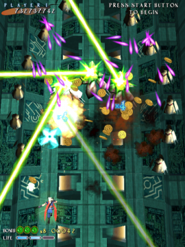 This time XS Games treated the game with a little more respect, as most everything is faithful to the Japanese version. The packaging actually advertises the game for what it is – a shoot-em-up with anime-influenced characters blowing up stuff. Even the tate option is still present.