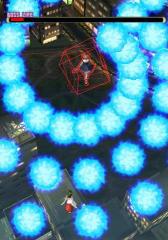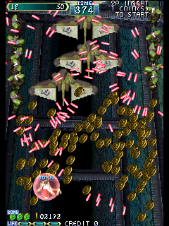 The normal pattern fire. Enemies release coins freely, which have to be gathered by the player. These attacks double in intensity if the player grazes enemy fire, meaning their shots are immediately next to the player's hitbox, similar to "buzzing" from Skonec's Psyvariar. This is called the Tension Bullet System, or "TBS". The hitbox is usually the very center of the character sprite, and they can not die unless it is struck, making it possible to weave through insane amounts of oncoming shots. However, rather than this being the focus of the gameplay, like Psyvariar, it's something you can take advantage of to win boss battles quicker and reach for higher scores. It's a brilliant risk-reward system, even though it involves squinting at the screen to figure out exactly where your characters hitboxes are.