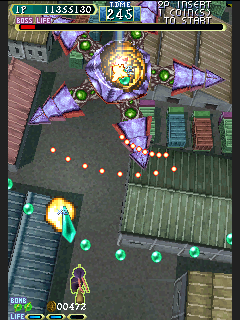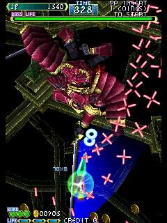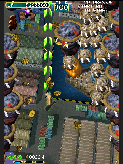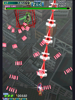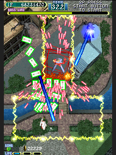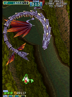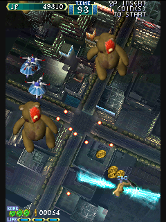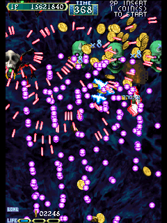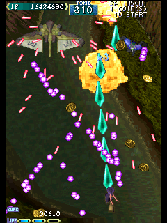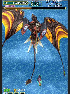 Similar to Cave's ESP Ra.De. and Espgaluda, you control humans who can fly through the skies. The landscapes are all 3D, but the ships and enemies are made of a combination of sprites and polygons. They're not exactly visually impressive and they lack the gorgeous spritework of Cave's games, but they have their own unique feel to them.