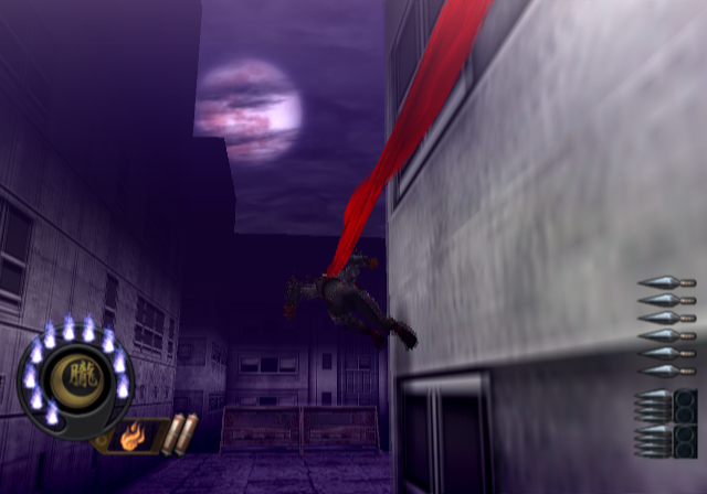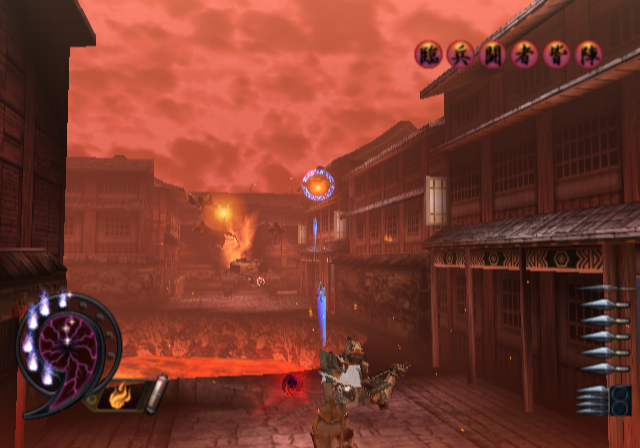 And it’s some damn good action. This one of the smoothest controlling 3D games ever made – Hotsuma runs, jumps, and attacks swiftly and gracefully, making the mere act of moving around an absolute joy. There’s a variety of standard ninja moves at your disposal, including the traditional double jump, although you now have the ability to grab onto almost any wall and run across it, completely giving the middle finger to that nonsense theory of gravity. Although you’ll do most of your fighting with a sword, you have a small arsenal of shurikens to stun enemies, and some ninja magic to use when needed. A handy lock-on maneuver makes it easy to spot any oncoming foes, although it’s sometimes too easy to misdirect your jumps when you’ve targeted an enemy, usually ending with a drop into a pit. Getting the hang of the controls takes awhile – you have to constantly use both analog sticks, the shoulder buttons to lock-on, and other buttons to dash, jump and attack, but once you get into the rhythm, simply playing the game is like an acrobatic ballet for your fingers.