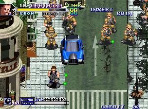 The basic gameplay is pretty much identical to the first game, but it’s been expanded on and modified with varying results. The buttons for jumping and bombing have been switched, and the D button no longer does anything because there isn’t a Team Mode anymore. Shock Troopers‘ health bar has been retained for 2nd Squad, but rather than a lone life you have three lives per credit. However, its difficulty has been given a major boost, and 1cc-ing the game will prove to be extraordinarily difficult. Each hit you take knocks off at least a good third of your health bar. The evasion technique works the same way, but it does not move your character as far out of harms way.