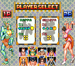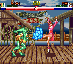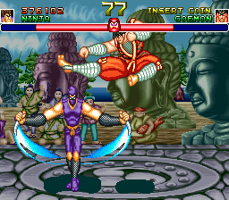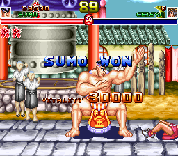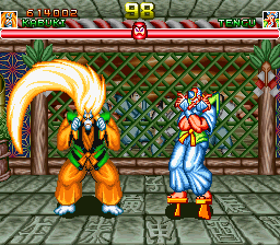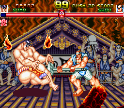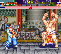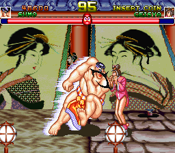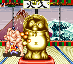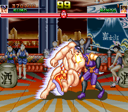 Sumo can be pretty fun to play as. All it takes to make him charge across the screen is tapping all four buttons at once. With his height, this move is meant more to knock jumping opponents out of the air with the right timing while also letting him quickly close the distance with his enemy. Unfortunately he’s missing in the sequel.