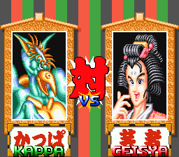 He has stretching limbs, an icy breath attack, and powerful kick moves he can use to repeatedly bounce off an opponent’s head. This is in addition to a move that lets him fly across the screen, letting him quickly get close to an enemy to grapple with them. Kaneko basically took cool things about Dhalsim and Chun Li from Street Fighter II: The World Warrior and combined them into one character. Like Geisya, his portrait looks very different from his sprite and more like a traditional depiction of a Kappa.