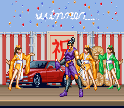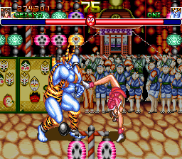 Geisya seems ordinary at first, but has one of the most powerful special moves in the game, an easy to execute move where she spins around while sliding forward to hit enemies multiple times. If all four hits connect, the attack will take off 75% of an opponent’s energy! Interestingly, the design displayed for her in the character select screen is significantly different from how her sprite looks in the game.