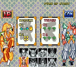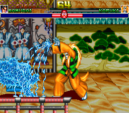 Like Kyoshiro in the later Samurai Shodown series, Kabuki is a Kabuki actor that fights with this massive hair. His special moves are almost useless, but his normal attacks are some of the best in the game. Due to the versatility of their normal attacks, Kabuki and Kappa are also very good choices to fight the game’s four bosses.