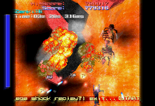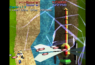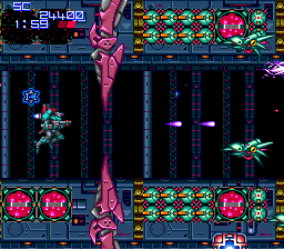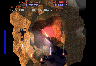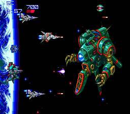Although it’s short, it’s an extremely cool, well designed game. The stage starts with your mech fighting alongside several other ships, before transforming into a jet and jumping into hyperspace. The rest of your squadron is taken out, and you’re left fighting the rest of the stage alone. When you reach the level boss, you fight it for a few seconds before a huge tentacle comes out of the side of the screen and skewers it, before jumping into view and commencing attack. The same device was used in the first level of Salamander 2, where you begin fighting the Golem (the one-eyed brain thing from the first level of Salamander/Life Force) before it’s eaten by a huge snake thing.
