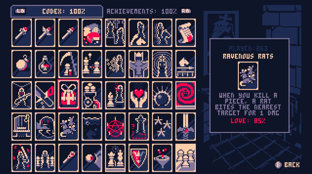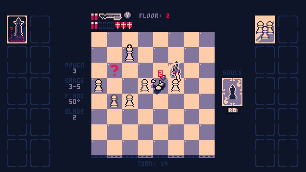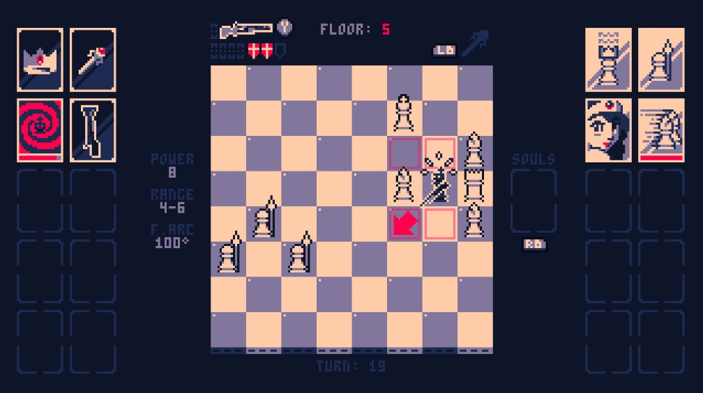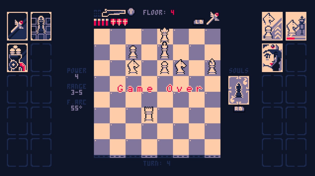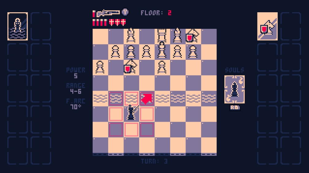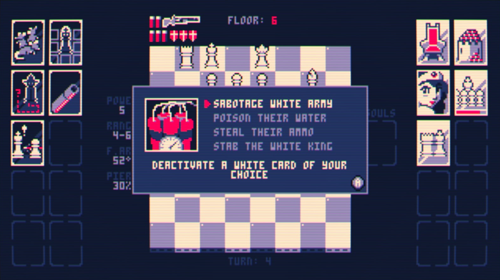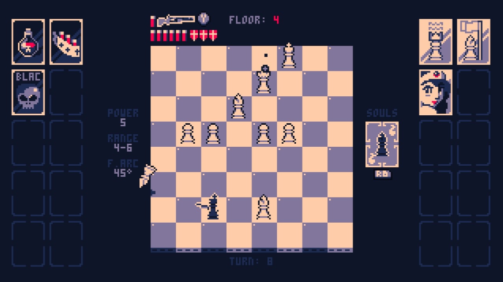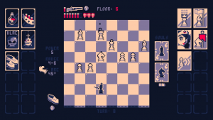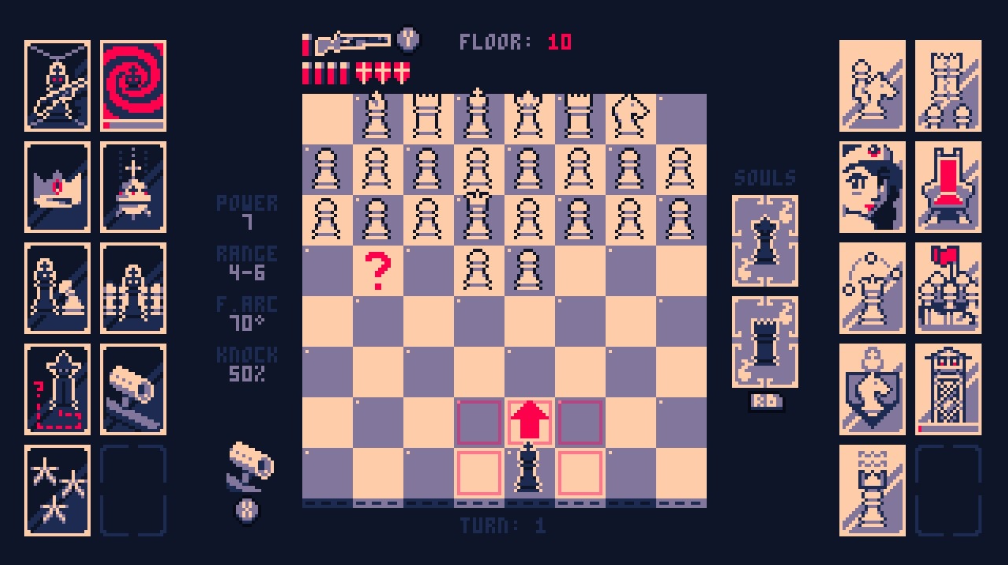 As is the case with many roguelikes, a single mistake is fatal, so Shotgun King has a shield system in place to let the player know when they’re in trouble; these can also be turned off in the menu if you’d rather rely solely on your own wits. If these shields are active, attempting to move the Black king into a position which would be fatal will result in the game removing one of those shields – you can have up to three, and they respawn every turn – while giving you a visual and audio warning to let you know that you’re about to die. These warnings are helpful, but they can also be a touch irritating if the danger in question is a piece that you are actively trying to shoot, and ergo will no longer be a threat to you once they are dead; although, in defense of the warning, if your shot fails to kill the target for whatever reason, then it will indeed kill you, and you’re left with the distinct feeling that the game is thinking “I told you so.” Also, these shields do not warn you if you are targeting a piece which happens to be the only thing protecting you from another piece, such as a pawn blocking the path of a queen, and destroying that pawn will kill you. There’s some debate amongst players as to whether this is a flaw or a feature, but I think it’s for the best that the game doesn’t give you too much help and still requires you to be aware of what’s happening across the board, literally.