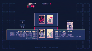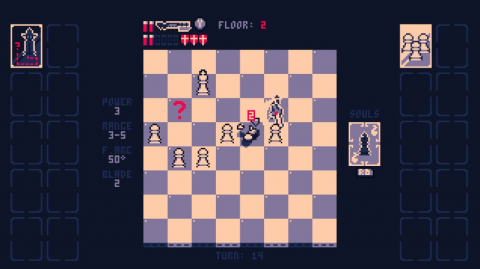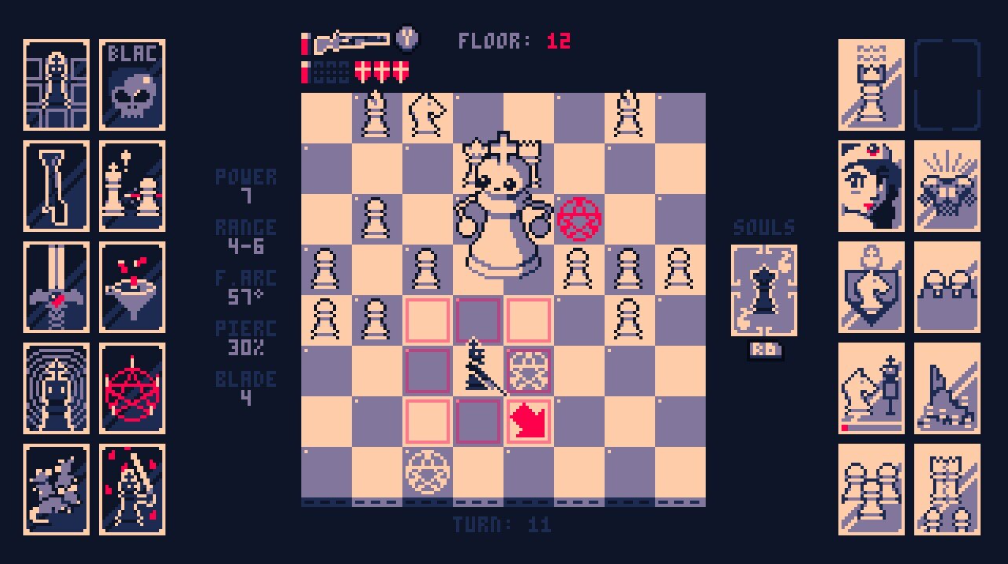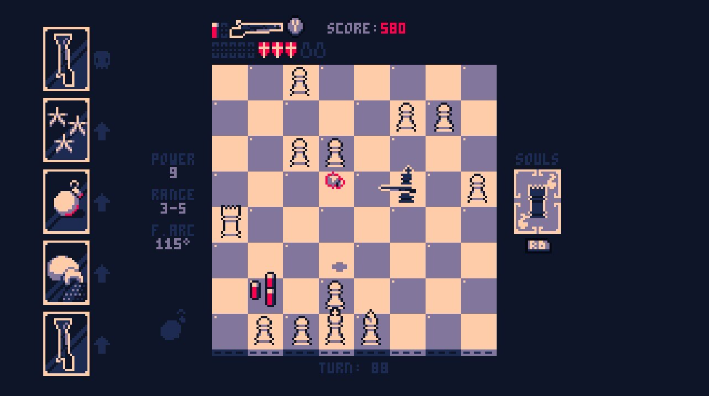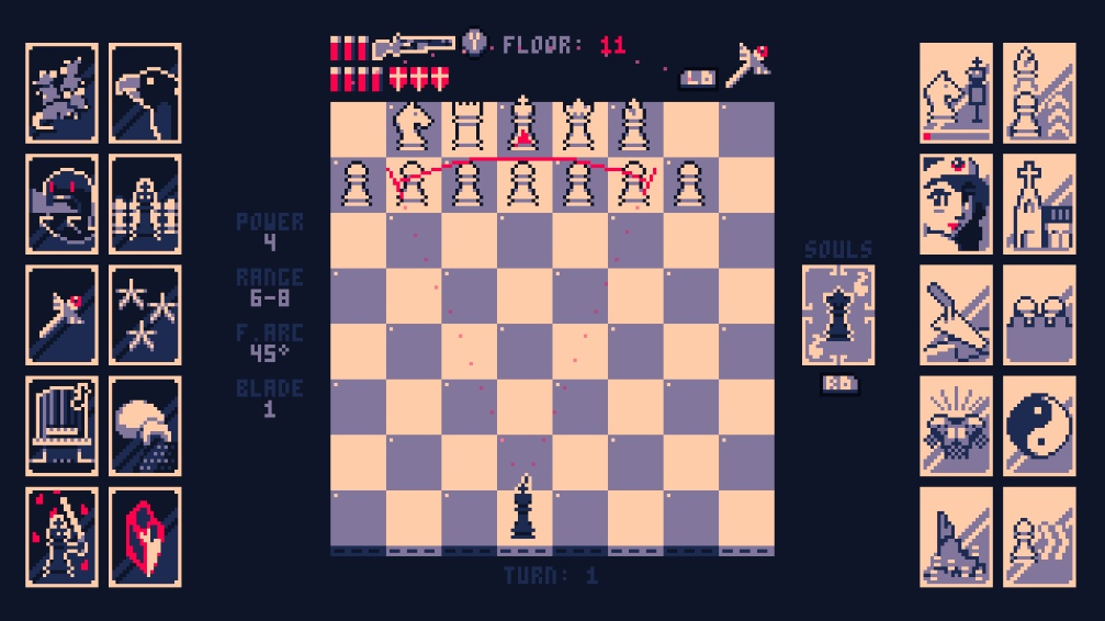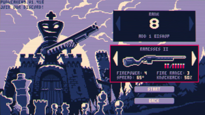 There is only one rule in Shotgun King, and that is to not end your turn while in check, or in a position where you are threatened by another piece. If every piece moved during every turn, this would be a nigh-impossible task as you constantly found yourself surrounded by bishops, pawns and rooks, but fortunately, every piece except for the Black king has its own designated speed, which determines how often it gets to move. Most commonly, this speed is set to once every three turns, although with certain power-ups, pieces can move faster or slower. To give the black king an additional advantage, when destroying a bishop, rook, queen or knight, you gain their soul, which can be used once to move in any way that the piece whose soul you captured could move, i.e. diagonally for bishops, horizontally for rooks; very useful if you ever find yourself pinned down and need to make a quick escape, and you can always follow this up by killing another piece, claiming another soul.