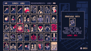 Like most roguelikes, the only real annoyance from the game comes from luck. It is entirely possible, albeit only on the game’s higher difficulty settings – of which there are fifteen to choose from, and which are unlocked by beating the previous difficulty setting – to simply not have the tools necessary to succeed. Some of the guns, several achievements, and even the secret final boss all require you to get very specific cards during your run, and with fifty-five black and white cards each, some of which can be chosen multiple times on the same run, getting three or four specific cards to show up is not impossible, but it is entirely out of the player’s control, which is never a good thing for a bonus challenge.