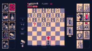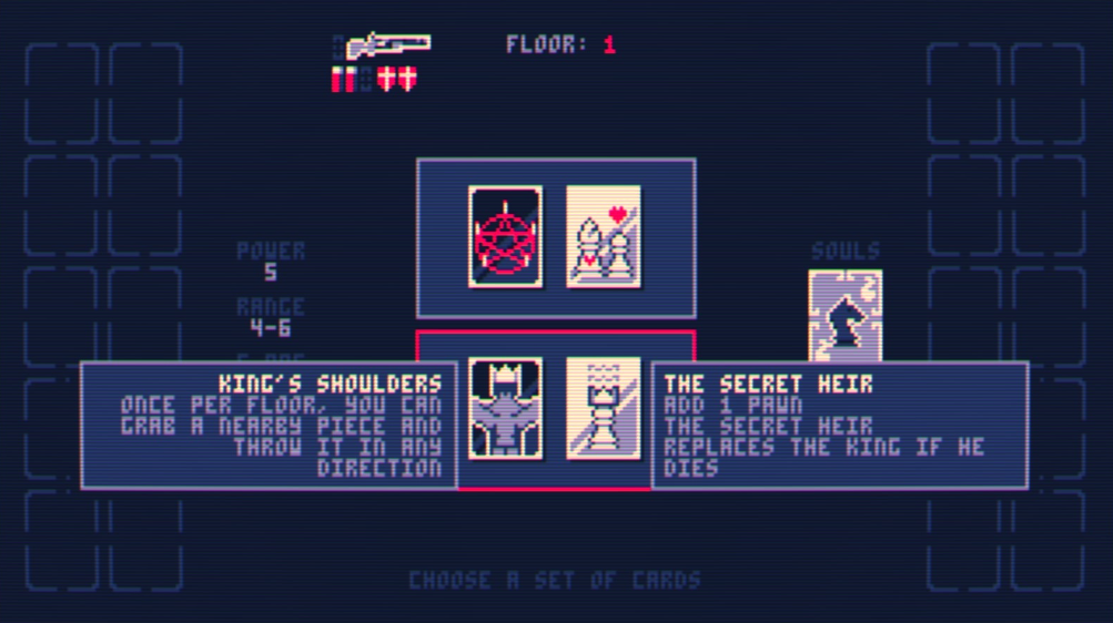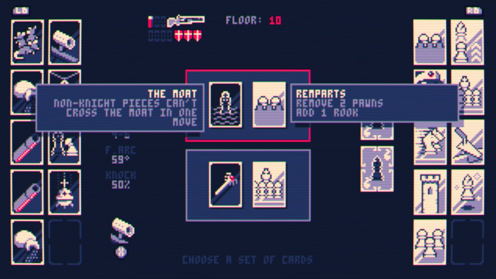 These are just the basics though, and where Shotgun King thrives are the upgrades. At the end of every stage, you are given two pairs of cards to choose from; a black card which benefits you, and a white card which benefits the enemy. Shotgun King takes cues from other classic roguelikes like The Binding of Isaac and Enter The Gungeon by having some traditional, standard power-ups for both sides, such as increasing your firepower or range, adding an extra knight or bishop, spawning an extra pawn every five turns, and so on. But the gameplay additions soon take on a weird and wonderful quality when you’re offered the ability to fire every bullet in your gun at once. Too simple? A moat, then. An entire moat across the fifth row of the board, which no pieces (except for knights) can cross in a single turn. What about spawning a rat every time you destroy a piece, which then attacks the closest enemy piece, possibly spawning another rat in the process? Or once per turn, the capability to hop directly over an adjacent enemy, dealing one damage, and then continuing your turn; not the flashiest move, but incredibly helpful at getting out of danger. Or, once per floor, the choice to lift a single adjacent piece up, and just throw it at another enemy? Or better yet, directly off the board for a free kill? Why even stick to your shotgun alone when grenades, swords, and wands of various effects are also available? It’s important to remember though, that these cards come in pairs; a very advantageous black card may be paired with a white card which, in your current situation, may effectively serve as a death sentence.
