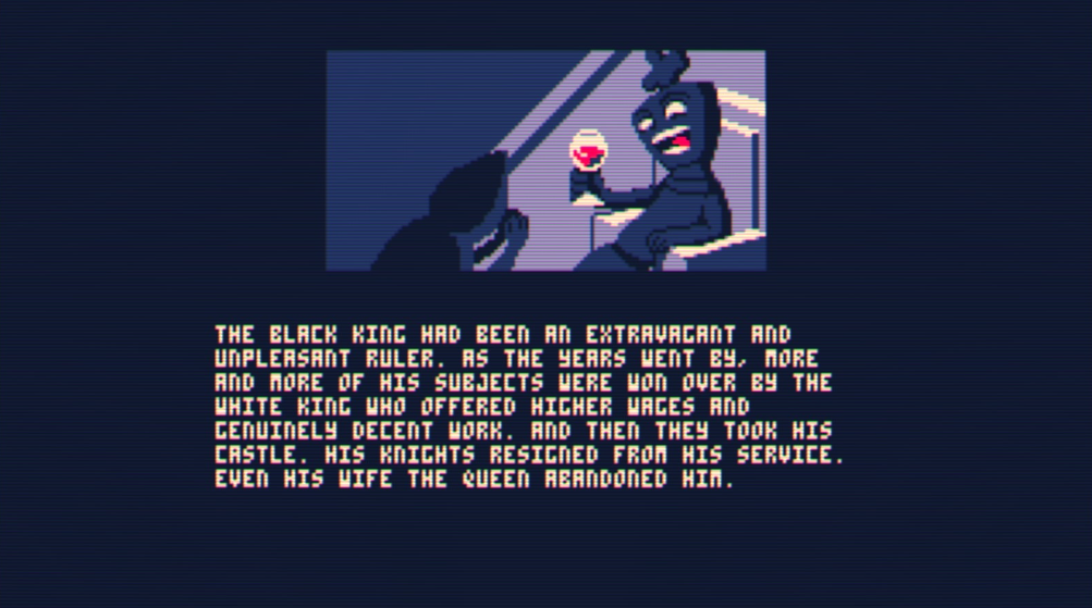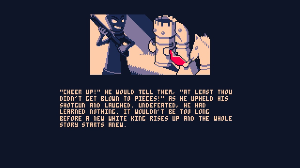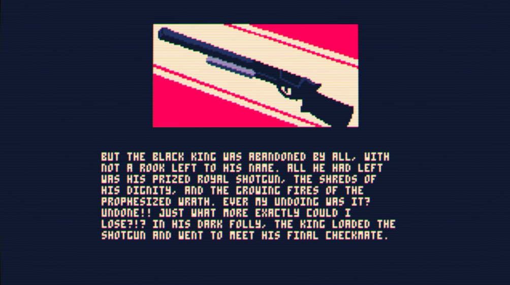 When it comes to selecting a base for your indie game to build upon, Chess is one of the most popular selections; behind Sokoban but seemingly ahead of Sudoku and Picross, at least in terms of the number of projects actually worth checking out. The rules are almost universally known, and easy enough to pick up if you somehow don’t know them; bishops can move diagonally, rooks can move horizontally and vertically, queens can do both, and knights can… well, you get the idea. The king is, ironically for what is on paper the most important piece in the game, mostly useless, capable of only moving one space at a time. But as the name “Shotgun King” implies, the black king in this game holds one more key advantage. A 12-gauge advantage with a firepower of 4 and a spread of 55 degrees. And he’s going to need it, since as the hasty cutscene at the beginning of the game explains, the Black king is a pretty terrible ruler who alienated all of his subjects, hence why they switched teams and he finds himself facing them alone, save for his trusty shotgun.