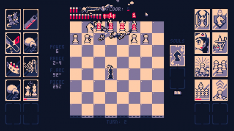 There is only one rule in Shotgun King, and that is to not end your turn while in check, or in a position where you are threatened by another piece. If every piece moved during every turn, this would be a nigh-impossible task as you constantly found yourself surrounded by bishops, pawns and rooks, but fortunately, every piece except for the Black king has its own designated speed, which determines how often it gets to move. Most commonly, this speed is set to once every three turns, although with certain power-ups, pieces can move faster or slower. To give the black king an additional advantage, when destroying a bishop, rook, queen or knight, you gain their soul, which can be used once to move in any way that the piece whose soul you captured could move, i.e. diagonally for bishops, horizontally for rooks; very useful if you ever find yourself pinned down and need to make a quick escape, and you can always follow this up by killing another piece, claiming another soul.