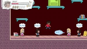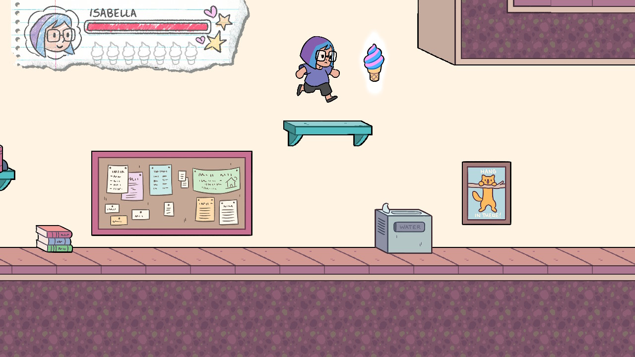 The first playable character, Isabella, is being pestered by bullies, especially Oakley. He fires projectiles at her in the form of insults. Get hit by too many insults and you’re back to the last checkpoint. Isabella can also take damage from standing on slime which covers some of the floors or touching piles of trash. And she refills her health by collecting ice cream.