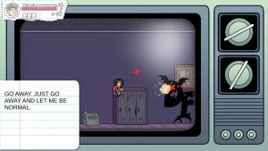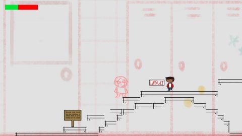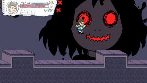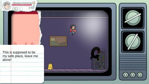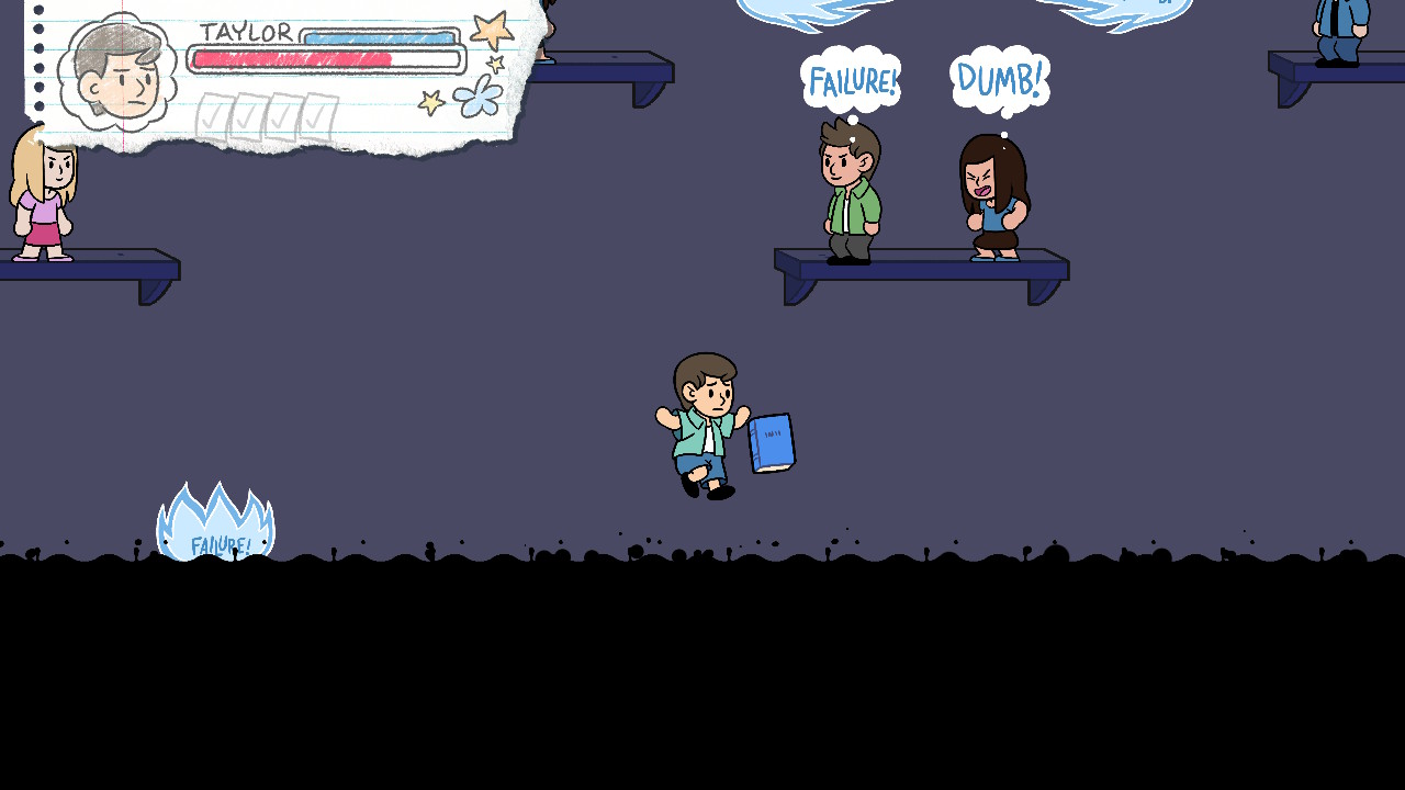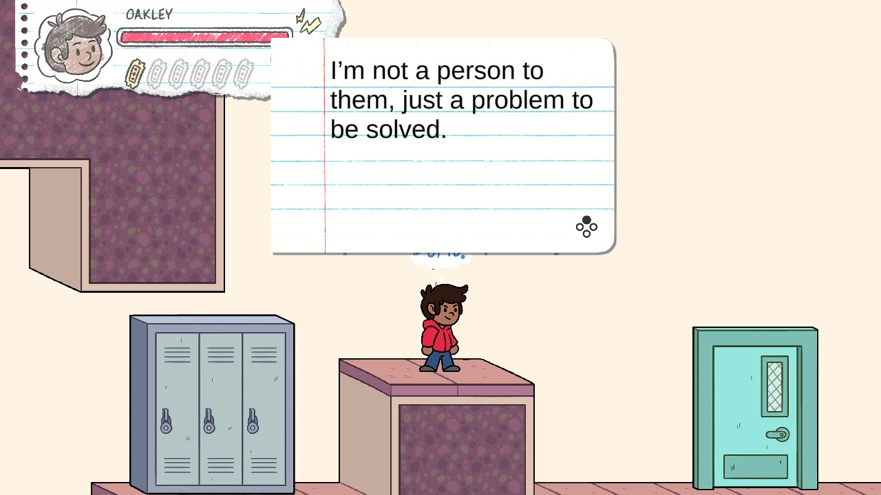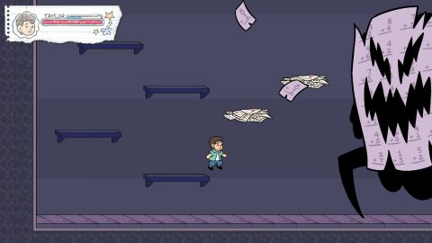 The game is a world of overt symbolism set entirely in a platformy, video-gamey representation of a school. Exaggerated versions of real world threats attack in “light” levels, while “dark” levels have more shadowy monster-like representations of even more abstract fears. Serving the role of moving platforms are cleaning robots and floating pieces of paper.