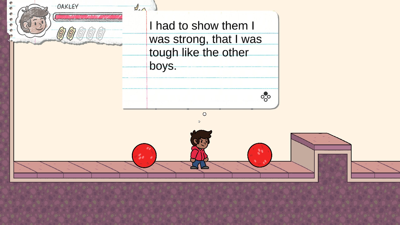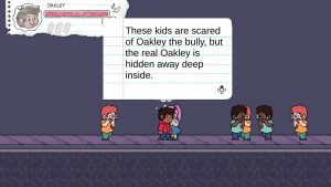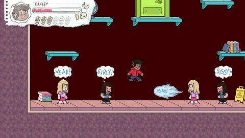 The answer comes when you open a door that drops you into a room where you’re suddenly assailed by girls who toss insults such as “WEAK,” “GIRLY” and “SISSY.” Oakley has no defense against the insults that actually hurt him, because he’s secretly gay and hides behind a tough guy persona. He doesn’t want anyone to know what the boy he has a crush on means to him.