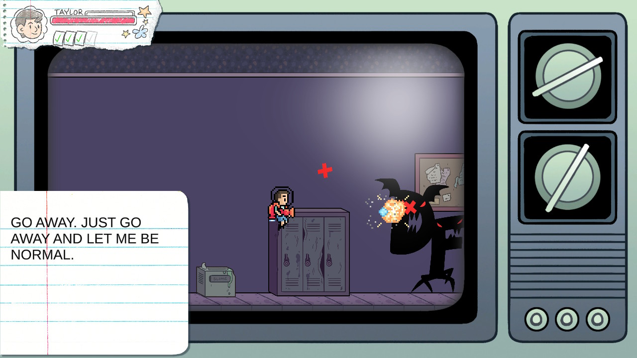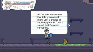 There’s easily things to criticize about Shredded Secrets if looking at it from a professional perspective, such as the storylines and their simplified understanding of the complexity of issues like bullying, depression and learning disabilities. And the gameplay is hardly a polished example of 2D platforming. Plus, the Switch version requires the use of a Joycon and doesn’t support the Pro Controller. But one can certainly say that the young developers’ hearts were in the right place, and some of the characters’ endings aren’t too picture perfect – for example, Taylor expresses relief at merely passing a test even without getting an A.