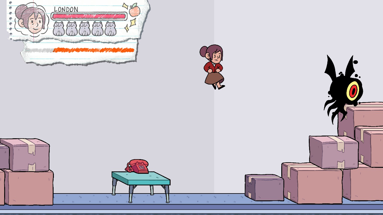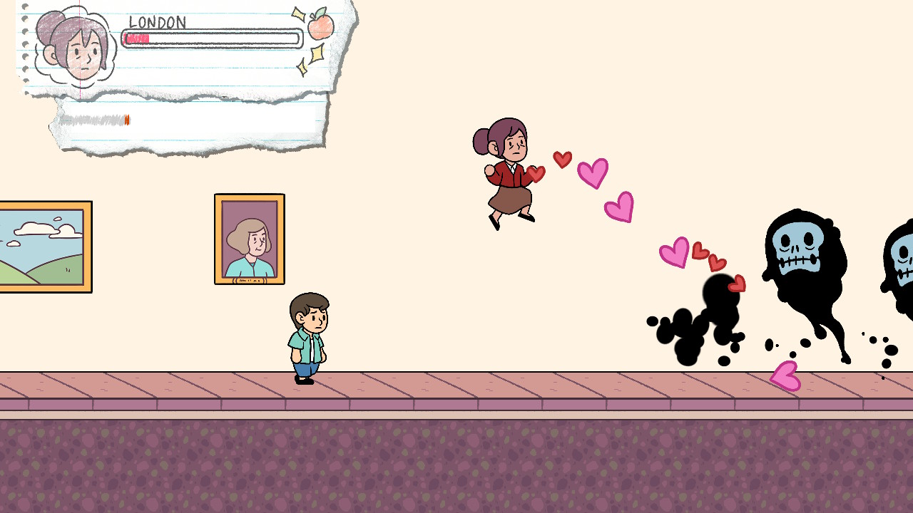 Her attack is to shoot valentine hearts and other symbols of positivity at shadowy demons which represent her mental problems. London also has her own unique obstacle – clingy students. Literally.