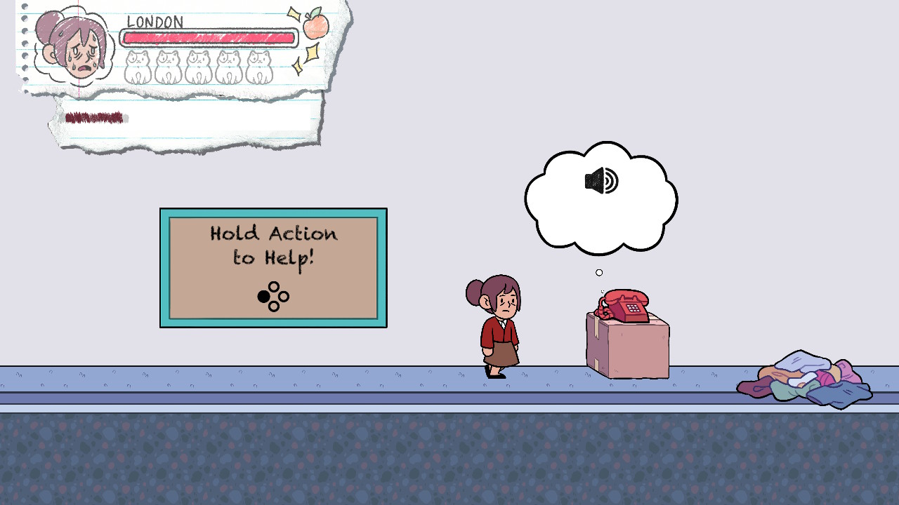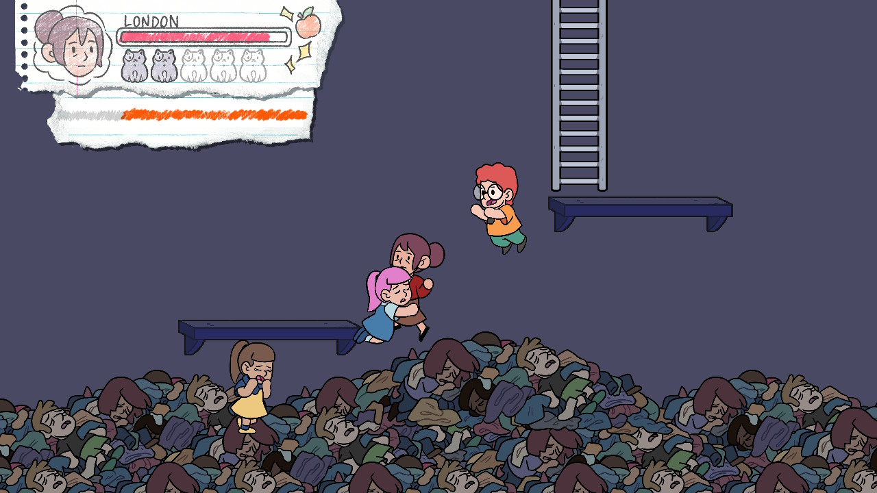 However, even with that budget, a lot of imagination is put into what’s done with it. The way characters’ stories cross over with each other adds depth to the narrative. And each character having a unique obstacle or gameplay mechanic themed after their own issues is a perfect example of the gameplay continually introducing new ideas as it goes along. Levels have collectibles which are themed after the current character. There are even creative details such as the piles of depressed kids lying on the floor in one of London’s levels. Their visual similarity to the piles of dirty laundry that exist in some of London’s other levels adds a sort of “wait a minute, is that…?” type of surprise.