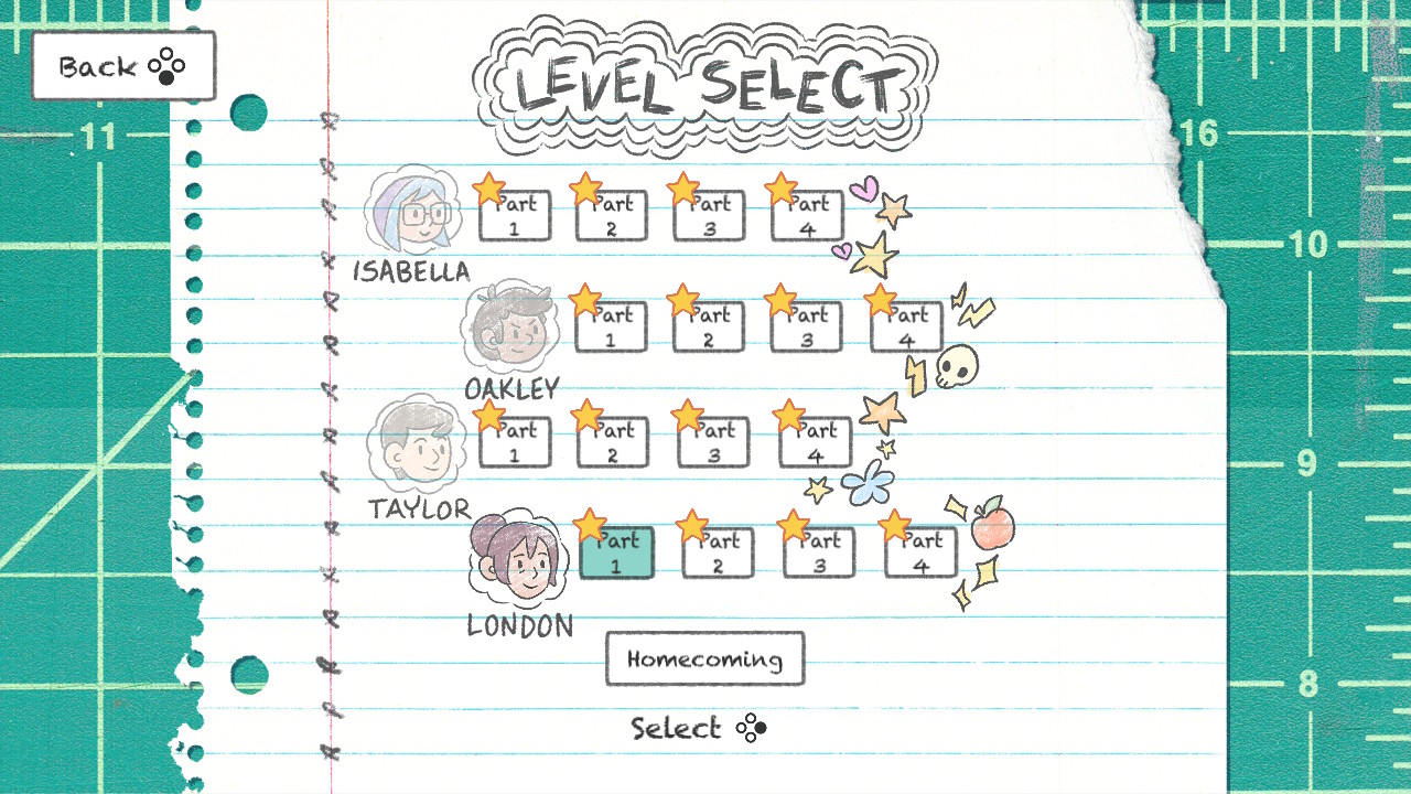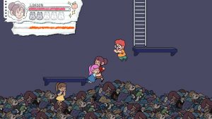 Shredded Secrets is a 2D platformer with hand-drawn graphics, set inside a school. Each character faces their fears in a very literal fashion, but first, let’s meet these characters.