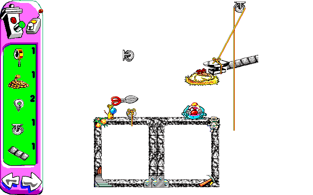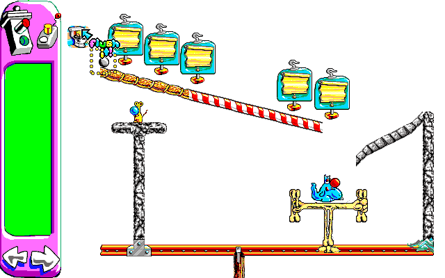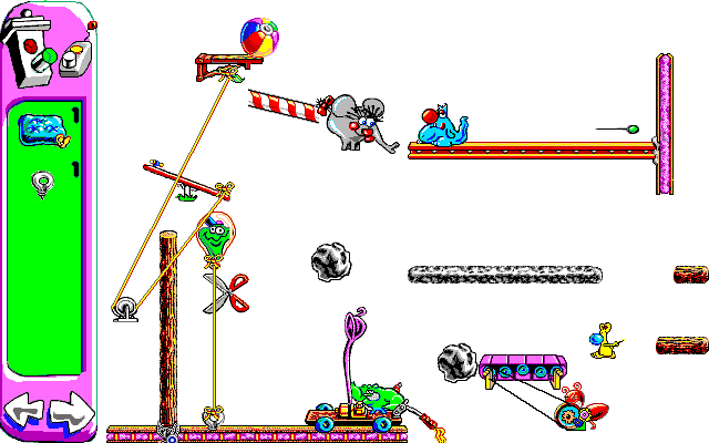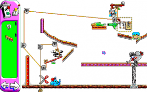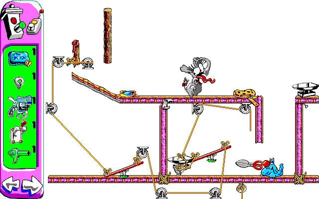 There’s also the fact that the animations take far longer to play out than Incredible Machine, which makes trying to trial and error your way through a puzzle take even longer. In one puzzle, you have to lead Sid towards a piece of cheese, where he takes about three seconds to eat it. He then stops to taunt Al before running away, which takes a couple of seconds on its own. He then has to climb a couple of ladders, which takes him about seven seconds. He then has to cross a see-saw with a rope you’ve hopefully tied in the correct way.