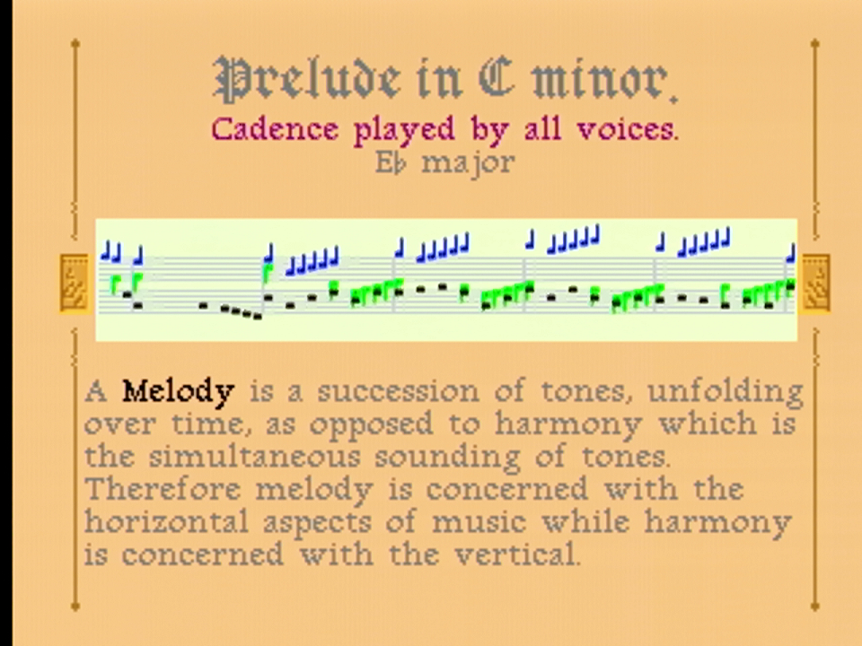 Since a 3DO disc would be awfully boring without anything on screen, C.P.U. Bach comes with four visual presets to go along with the music. They range from a basic kaleidoscope-style visualizer, to a gallery of scrolling nature photographs, and even a Musical Analyzer that displays the musical notations of the piece being played, along with a textual description of what each instrument is doing, and some definitions of the musical terminology being used. Bach himself even shows up for the “In Concert” setting, playing the lead instrument of the current piece, while typically accompanied by floating instruments that represent the rest of the orchestra. These are not mere canned animations; they are quite accurate to the actual instruments being played, and the fingering and operation of the instruments is certainly close enough to be convincing.